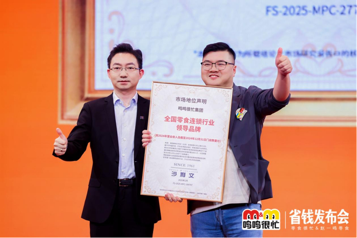2025年2月17日,鸣鸣很忙在北京水立方召开“省钱战略发布会”,鸣鸣很忙创始人晏周、鸣鸣很忙创始人赵定共同亮相,并以555亿年零售额、1.5万家门店的行业龙头地位,宣布全面落地自有品牌、双品牌全新升级、3.0店型升级的新业态战略。