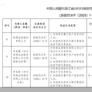 新年券商反洗钱首份罚单!财通证券及员工合计被罚超200万元