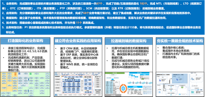 2023年6月,徐工正式启动了这一具有深远意义的董事长一号工程,开启了全价值链转型升级的新篇章。项目围绕内涵式高质量增长和效率效益提升,精心规划并稳步推进智改数转网联工作。整个项目分阶段实施,一阶段明确转型方向,二阶段规划蓝图及路径,三阶段推动转型落地,确保每一步都坚实有力。在转型过程中,徐工采用“六经六纬”矩阵式体系化变革方法论,通过“转型方向 - 关键举措 - 转型任务”两级拆解方法,将各项工作精准落地,确保转型工作形成闭环,有序推进。在战略管理上,采用新方法和工具,强化市场洞察和战略解码,验证了徐工4A企业架构模型,提升了管理效率。组织架构上,重构总部组织,成立多个国际化、数字化中心,突出总部“治理”与平台“赋能”功能。同时,与众多顶尖企业建立数字化生态伙伴关系,壮大数字化队伍,提升生态竞争力。项目管理上,建立7大项目群,解决了项目建设孤岛问题,增强了项目关联性与协同性。数字化转型成果更是斐然,多家子公司通过国家智能制造成熟度高等级认证,新增智能制造示范工厂和绿色工厂,加速了智能制造进程。全球化共享平台建设取得突破。全球采购中心建立高效透明体系,赢得国际奖项;全球财务共享中心推动财务转型,提高核算效率;全球数字化中心构建云服务和数据平台,整合数据,构建行业数据空间和资产。同时,全球一体化运营初见成效,打造数字化运营模板,实现业务流程一体化,计划全球推广。