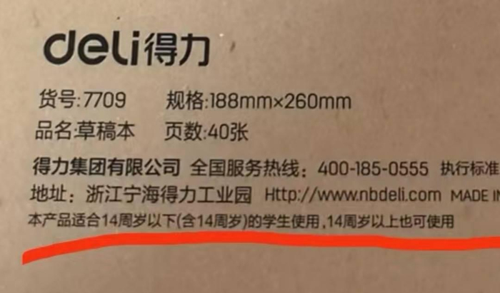 近日,有黑龙江网友购买了一本得力笔记本,在笔记本的背后相关信息的最下方,印着一小行字:“本产品适合14周岁以下(含14周岁)的学生使用,14周岁以上也可使用”。对此,网友觉得十分困惑,“感觉是句废话啊,为啥要加这句话?”