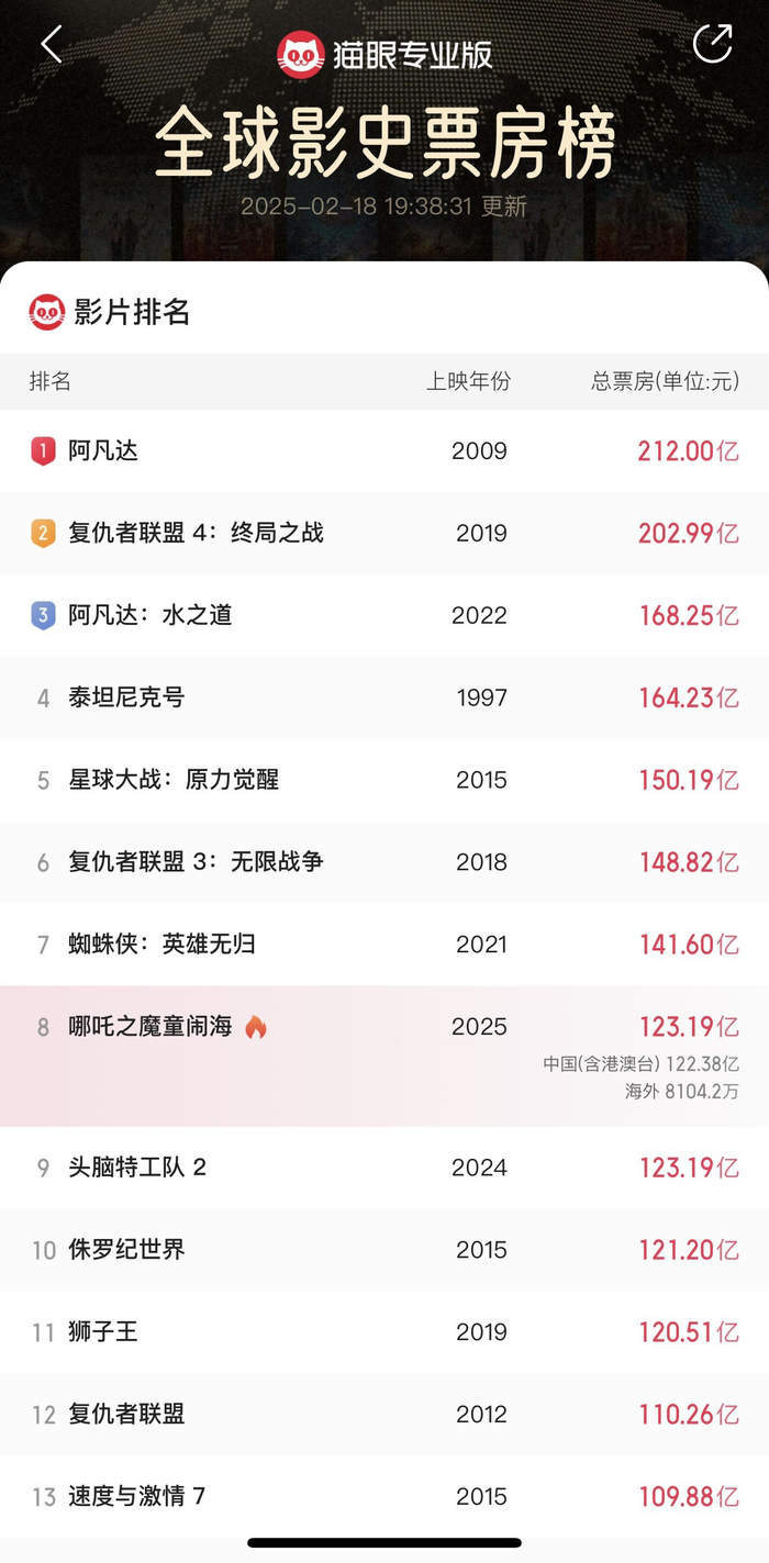 中国经济网北京2月18日讯(记者宋雅静)据猫眼专业版最新数据,截至2025年2月18日19时38分,国产动画电影《哪吒之魔童闹海》(简称《哪吒2》)全球总票房突破123.19亿元,成功超越《头脑特工队2》,荣登全球动画电影票房榜首!