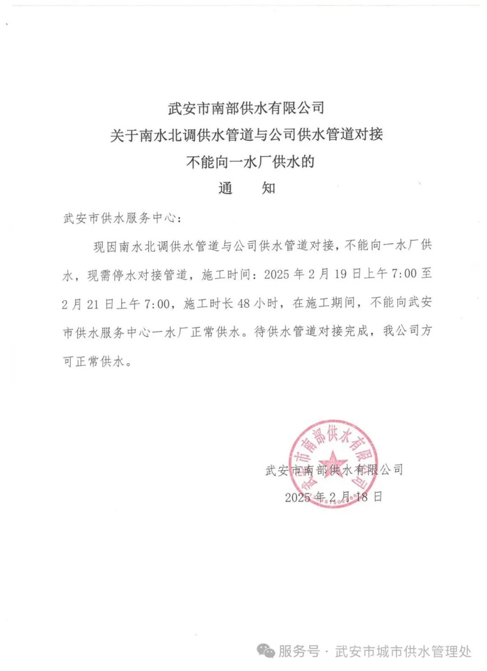 2025年2月18日下午,武安市供水服务中心接到水利局南部供水公司通知,因南水北调供水管道与南部供水公司供水管道对接,2月19日早7时至21日早7时不能向武安市供水服务中心一水厂供水,直接影响城区中西部区域正常供水。