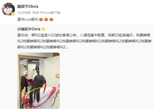 周星驰经纪人陈震宇也在社交平台晒出周星驰cos哪吒的背影照,并配文:星爷cos哪吒。