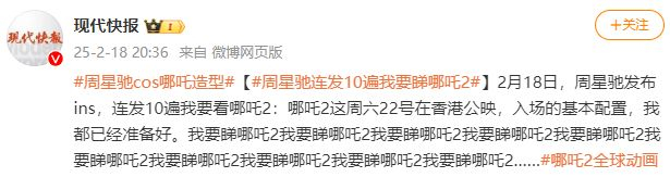 据现代快报,2月18日,周星驰在社交平台连发10遍“我要看《哪吒2》”:“我要睇哪吒2我要睇哪吒2我要睇哪吒2我要睇哪吒2我要睇哪吒2我要睇哪吒2我要睇哪吒2我要睇哪吒2我要睇哪吒2我要睇哪吒2……”