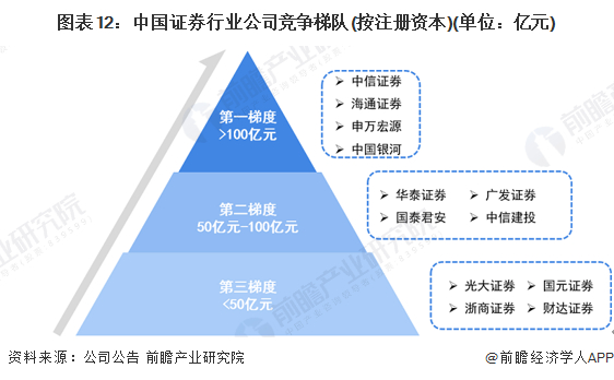 证券行业依据企业的注册资本划分,可分为3个竞争梯队。其中,注册资本大于100亿元的企业有中信证券、海通证券、中国银河、申万宏源等;注册资本在50-100亿元之间的企业主要有国泰君安、华泰证券、中信建投以及广发证券等;注册资本在50亿元以下的企业有光大证券、浙商证券、国元证券、财达证券等。
