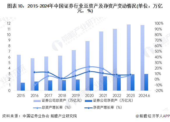 经过三十多年的发展,中国资本市场从无到有、从小到大,实施包括股权分置改革、多层次的市场建设、注册制改革等一系列重大改革举措。证券业是提供专业服务的竞争性行业,通过参与国际市场竞争,对于改进服务水平、增强服务实体经济能力,更好地服务经济高质量发展具有重要意义。2016年以来,我国证券行业资产规模不断扩容,截至2024年上半年,证券行业总资产规模达到11.75万亿元,行业净资产为3.01万亿元。