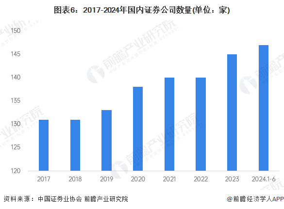 证券行业公司间产品差异较小,行业供给主要体现在证券公司数量以及营业部数量等方面。根据中国证券业协会数据显示,截至2024年6月,国内证券公司数量共有147家,近年来我国证券行业供给总体保持稳定增长。