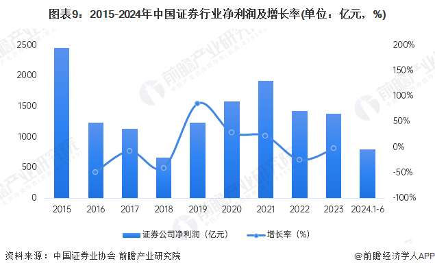 证券行业是强周期行业,盈利波动比较大。2015年受牛市影响,证券公司全年净利润高达2447.63亿元。2017年受再融资、减持新规的影响,投行业务利润下降。截止2018年底,净利润666亿元,同比减少40.54%。2019年净利润恢复之前水平。一直倒2021年度证券行业业绩持续改善,净利润超过1900亿元,同比增长21.32%,净利润增速明显超过收入增速,盈利状况持续提升。2022-2023年由于市场行情及交投情绪均趋低迷,行业净利润同比下降。2024年上半年,证券行业净利润约800亿元。