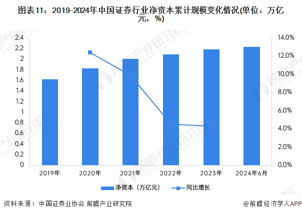 从净资产规模来看,从2019年的1.62万亿元增长至2023年的2.18亿元,截至2024年上半年,进一步增长至2.23万亿元。