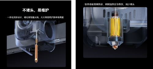 对打印成功率有重要影响的挤出机上,Creality Hi Combo 的快拆喷嘴采用钛合金喉管和纯铜加热块,分区分时精确温控,减少堵头。