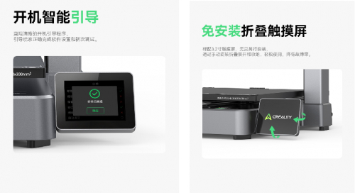 Creality Hi Combo 在开箱体验方面做到了极致,调试与装配出厂已完成 95%,用户到手 8 分钟内就能组装完毕,直观的开机引导帮助用户快速完成系统配置。