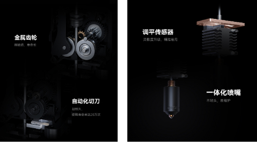 全金属齿轮,无弹簧磁吸切刀以及硬化钢尖端,都大大提升了耐用性,长期使用更省心。打印中,为保证挤出均匀,减少模型边角缺料和膨大,设备可以实时测量调整压力提前 (PA) 值。不用打印测试模型就能完成校准并保存参数,提高挤出精度。