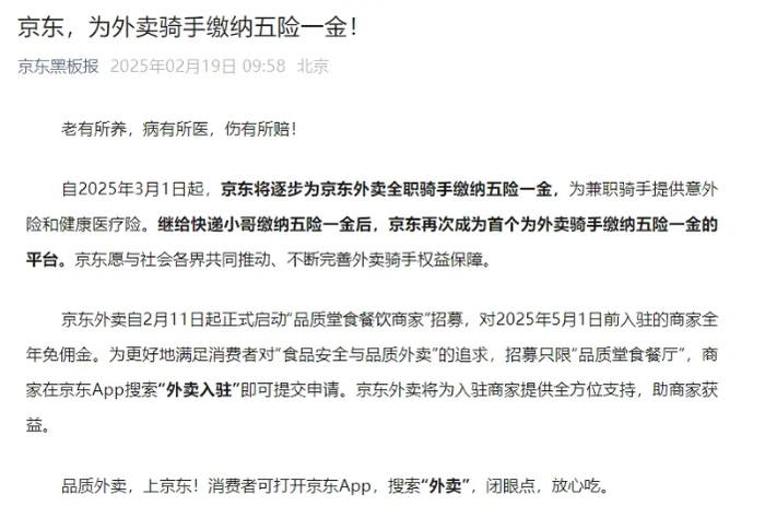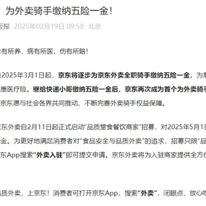 京东黑板报官方公众号19日上午发文称,自2025年3月1日起,京东将逐步为京东外卖全职骑手缴纳五险一金,为兼职骑手提供意外险和健康医疗险。