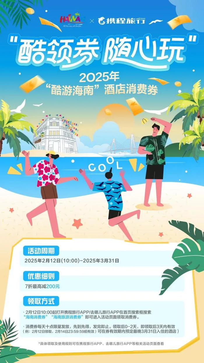 据海南省旅游和文化广电体育厅相关负责人介绍,从2月中旬至3月31日,海南省还将通过“酷游海南”小程序等渠道陆续发放100万元酒店消费券,吸引更多岛内外游客奔赴春日盛景,享受海岛度假时光。