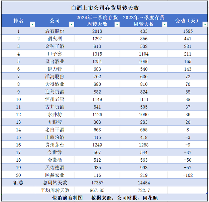 库存积压还体现在库存周转天数的显著拉长上。2024年三季度末,20家白酒企业的存货周转天数平均高达867.85天,周转天数超过1000天的酒企有7家,占比35%。