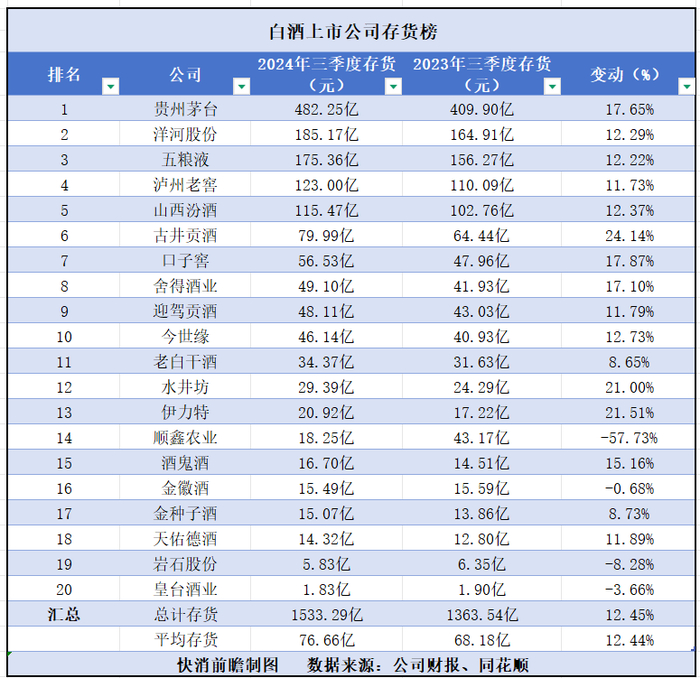 快消前瞻根据20家上市白酒公司财报数据,整理了20家上市酒企2024年三季度存货与2023年三季度存货数据的对比。