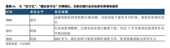 中信建投认为,库存周期看,白酒或将先动销后业绩。与“四万亿”、“棚改货币化”时期白酒行业周期对比,2008年正处于白酒行业高速发展期,金融危机阶段性打断行业节奏,市场库存处于相对适中水平:2015年,白酒行业处于深度调整期末期,新消费结构初步形成,市场库存经过近3年的调整处于较低水平;因此,2009年、2016年主流品牌在经济刺激措施下业绩很快提速,强需求和消费升级驱动下高端酒价格得以上行。