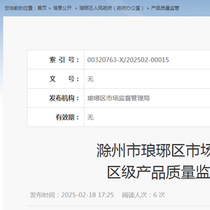 中国质量新闻网讯 近日,安徽省滁州市琅琊区市场监督管理局通报2024年区级产品质量监督抽查情况(第二期)。