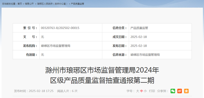 安徽省滁州市琅琊区市场监督管理局通报2024年区级产品质量监督抽查情况(第二期)