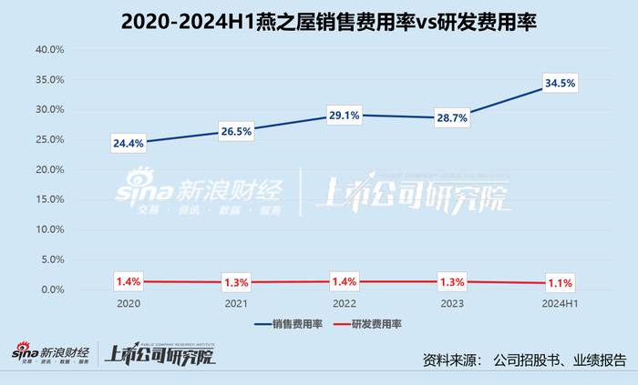 除此之外,燕之屋在营销方面向来不吝投入,尤其热衷于找明星代言。从2018年开始,公司已经更换了刘嘉玲、林志玲、赵丽颖等6位代言人,2024年更是签约巩俐和王一博形成“高端+年轻化”双线策略。2024年短短六个月内,公司销售及经销开支高达3.65亿元,同比激增38.5%,销售费用率攀升至34.5%,主要归因于代言费及宣传推广费用的增加。与之形成鲜明对比的,是燕之屋的研发费用率,常年徘徊在1%上下。