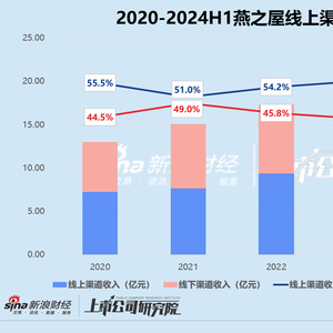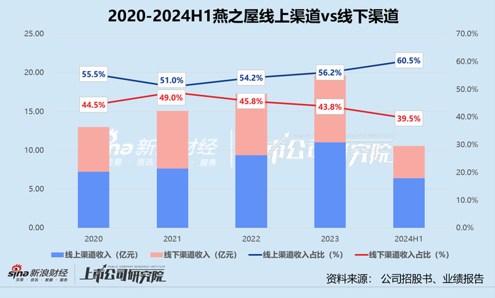 在这样的大环境下,燕之屋的业绩表现不尽如人意。2024年上半年,公司线下门店总数共计740家,较2023年同期净减少3家。线下收入同比下滑1.6%至4.19亿元,对总营收的贡献比例由44.7%下滑至39.5%,首次跌破40%。其中,直接向线下客户销售收入同比减少约4%,向线下经销商销售收入增长近乎停滞。