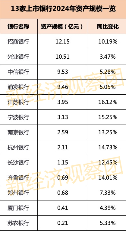其中,江苏银行、宁波银行、杭州银行、齐鲁银行、南京银行、长沙银行、招商银行等共计七家银行增速超过10%,分别达到16.12%、15.25%、14.73%、14.01%、13.25%、12.45%、10.19%。其余六家增速为个位数。另外郑州银行、苏农银行、中信银行和浦发银行增速超过5%。而在2024年,兴业银行总资产仅增长3.47%,位居13家之末。