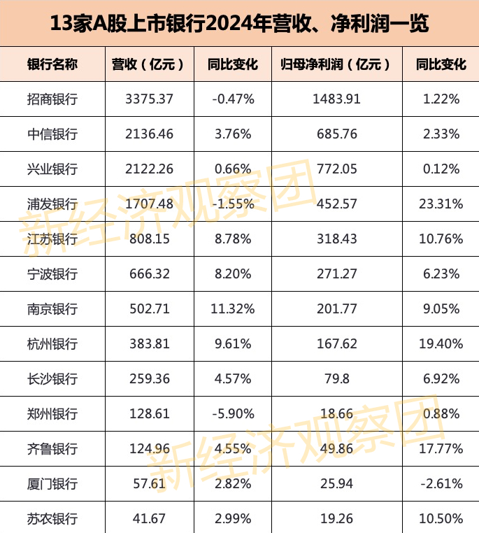 2025年新春伊始,A股市场迎来了13家上市银行发布的年度业绩快报,包括招商银行、中信银行、兴业银行、浦发银行4家股份制银行,江苏银行、宁波银行、南京银行等8家城商行以及苏农银行1家农商行,为新的一年带来了积极的信号。在全球经济形势复杂多变、国内持续推进高质量发展的大环境下,银行业作为国民经济的重要组成部分,展现出较为稳健的发展态势。