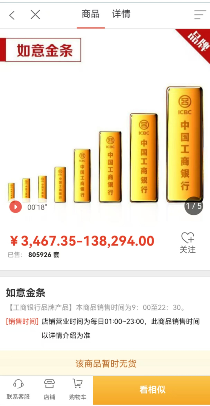 2月18日下午,记者登录工商银行App,页面显示该行线上售卖的如意金条5g、10g、20g、50g、100g、200g规格均售罄。当日晚间,记者再次登录,页面显示规格10克的金条可以购买,价格为6934.7元。另一款“筑梦中华金条”20克和100克规格无货,50克规格是价格为34623.5元,算下来为692元每克。