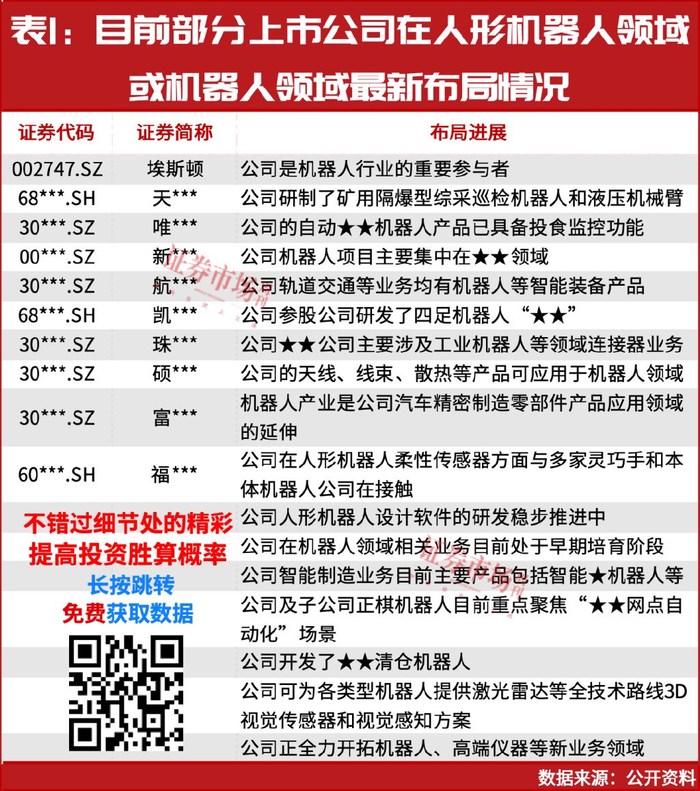 此外,还有多家上市公司宣布了在机器人领域的最新布局情况 (见表1, 识别表中二维码后“加入学习”即可免费获取 )。