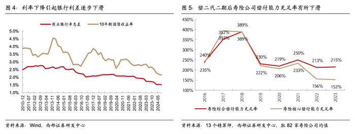 3)保险:利差损风险和偿付能力压力下具有配置安全资产的需求。由于传统险具有刚兑属性,利率下行背景下保险公司面临一定的利差损风险。为缓解保险公司的利差损压力,金融监管总局于2023年和2024年两次下调人身险产品预定利率;同时建立预定利率与市场利率挂钩及动态调整机制,以促进险企资负匹配。另外,偿二代二期实施后保险公司偿付能力充足率明显下降,因此2024年12月,金融监管总局将偿二代二期过渡期由2024年底延长至2025年底。2024年9月,国务院发布保险行业新“国十条”,提出建立以风险监管为本的制度体系等措施,推动保险行业高质量发展;在长端利率维持低位、偿付能力承压、海外投资审慎的前提下,安全性权益资产是险企投资的重要选择。