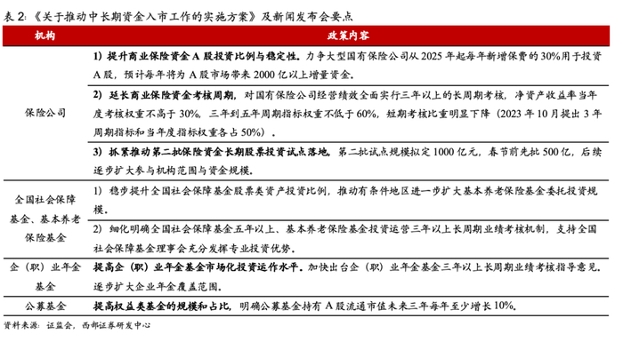 2025年1月22日,中央金融办等六部委发布《关于推动中长期资金入市工作的实施方案》;1月23日国新办就推动中长期资金入市答记者问,主要提出以下措施:1)提升商业保险资金A股投资比例与稳定性,力争大型国有保险公司从2025年起每年新增保费的30%用于投资A股,我们基于大型国有险企的经营现金流进行计算,预计每年将为市场带来2000亿元以上资金。2)延长商业保险资金考核周期,对国有保险公司经营绩效全面实行三年以上的长周期考核,净资产收益率当年度考核权重不高于30%,三年到五年周期指标权重不低于60%,短期考核比重明显下降。2)推动第二批保险资金长期股票投资试点落地,第二批试点规模拟定1000亿元,后续逐步扩大参与机构范围与资金规模。