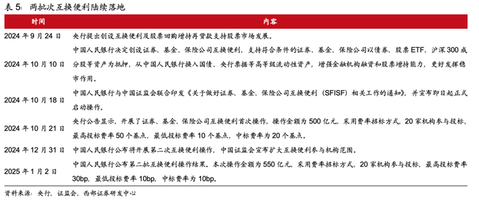 两批次互换便利陆续落地,操作细则逐步优化。2024年9月24日,央行提出创设互换便利及股票回购增持再贷款支持股票市场发展,2024年10月18日,互换便利(SFISF)的操作细则出炉并从即日起正式启动操作。互换便利指非银机构以债券、股票ETF、沪深300成份股等资产为抵押,从中国人民银行换入国债、央行票据等高等级流动性资产,机构再将获得的国债或央票在银行间市场以回购方式进行融资,将所换资金投向资本市场,用于股票、股票ETF的投资和做市。2024年12月31日,央行及证监会开展第二批互换便利操作,2025 年 1 月 2 日,第二次互换便利操作圆满完成招标,同时互换便利细则也进一步优化:1)质押品范围进一步扩大,允许参与机构提交持有的限售股、港股通项下持有股票等;2)中标费率由首次的20bp降至10bp;3)中国结算特批对参与互换便利业务的证券、基金、保险公司涉及的证券质押登记费实施减半收取的优惠措施。多项政策红利有望进一步提升机构参与互换便利的积极性。