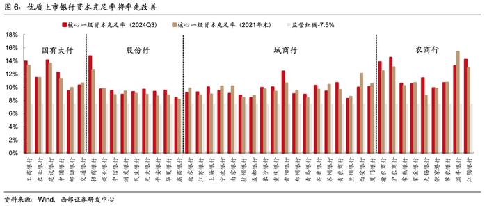 银行分红表现基本与内生资本补充能力强挂钩,国有大行将率先受益于政策支持。国家金管总局表示,国家计划对六大国有行增加核心一级资本,将按照“统筹推进、分期分批、一行一策”的思路,有序实施。2024年10月,财政部部长蓝佛安在国新办新闻发布会上表示,将发行特别国债支持国有大型商业银行补充核心一级资本,提升大行支持实体经济的能力。因而,在不发生系统性风险的前提下,银行分红逻辑能够长期维持。