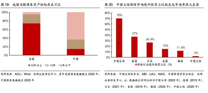 2)海外资产方面,如日本、英国或中国台湾地区等本地市场因资产供给问题无法满足险资配置需求,则以扩大海外投资的方式寻求超额收益,并优化期限结构。但目前地缘和外汇风险提升、外部市场不确定性加剧,我国险资出海未具备成熟条件,且境外权益市场进入渠道较少,以QDII额度为主;新“国十条”提出要“稳慎推进全球资产配置”。