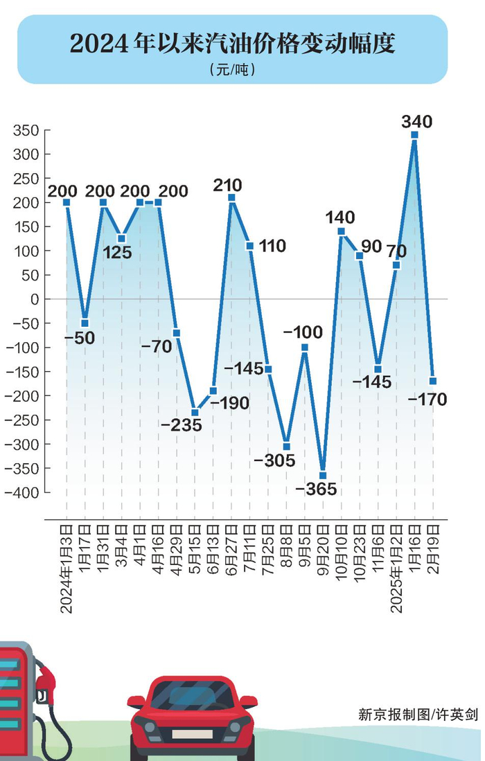 2月19日24时,国内成品油零售价格年内首次下调。据国家发展改革委消息,根据近期国际市场油价变化情况,按照现行成品油价格形成机制,自2025年2月19日24时起,国内汽、柴油价格(标准品)每吨分别下调170元和160元。