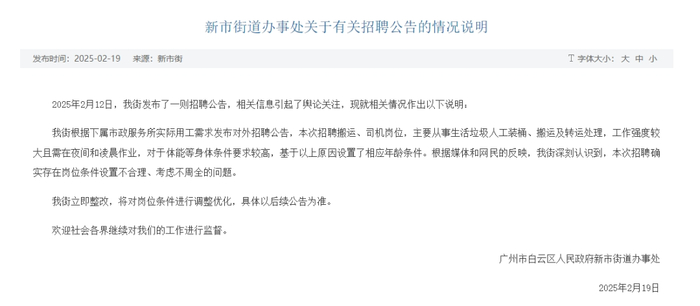 对此,广州市白云区政府网站2月19日发布《新市街道办事处关于有关招聘公告的情况说明》。