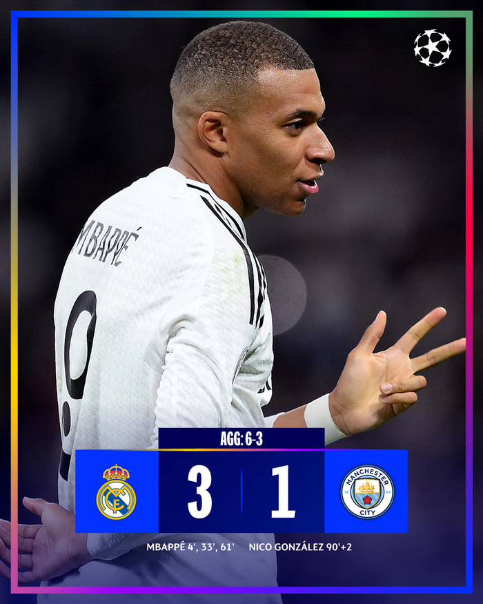 热闻|姆巴佩上演帽子戏法!皇马总比分6-3战胜曼城轻松晋级欧冠16强!
