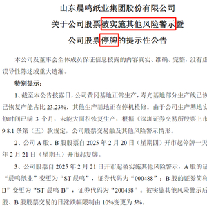 公告显示,晨鸣纸业A股、B股股票自2月20日开市起停牌一天,自2月21日开市起复牌。公司股票自2月21日开市起被实施其他风险警示,A股证券简称由“晨鸣纸业”变更为“ST晨鸣”,证券代码为“000488”;B股证券简称由“晨鸣B”变更为“ST晨鸣B”,证券代码为“200488”。实施其他风险警示后,公司A股、B股股票交易的日涨跌幅限制由10%变更为5%。