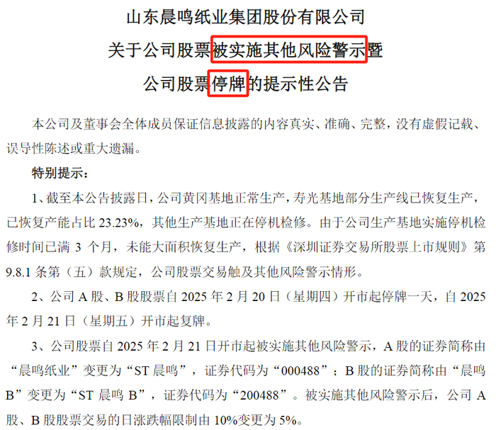 彼时,晨鸣纸业公告称,公司对寿光基地部分生产线、湛江基地部分生产线、江西基地及吉林基地实施了临时停机检修。截止本公告披露日,寿光基地、湛江基地及吉林基地正在停机检修,进行技术改造,争取尽快恢复生产;江西基地将于12月23日前恢复生产。如果公司前述生产基地在2025年2月底之前不能恢复生产,公司股票交易可能被实施其他风险警示。
