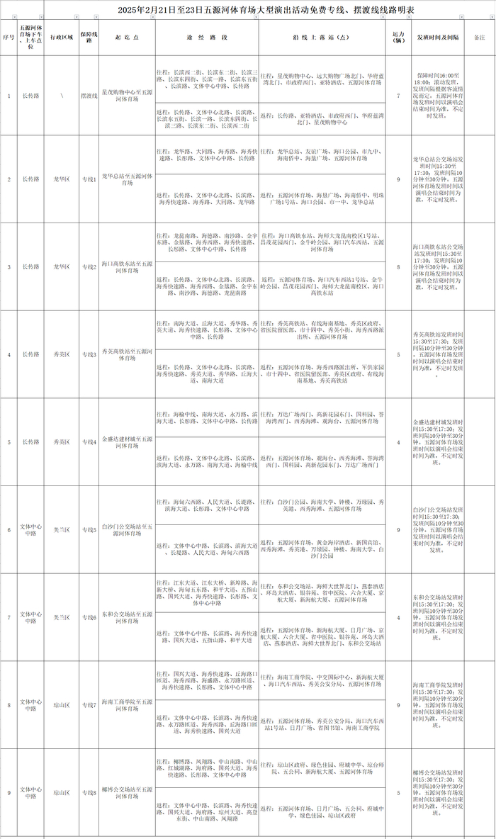 海口公交分别在龙华总站、海口高铁东站、高铁秀英站、金盛达建材城(抵达五源河体育场长传路),白沙门公交场站、东和公交场站、海南工商学院、椰博公交场站(抵达五源河体育场文体中心中路)开通8条免费公交线,投放53辆公交车,观演群众可在各点位乘坐免费公交车抵达五源河体育馆,返程上车点即为往程下车点。