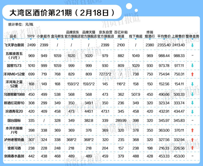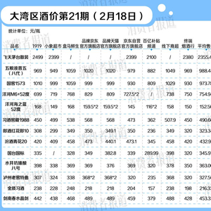 对比上期(2月6日),本期《大湾区酒价》多款白酒由涨转跌,其中飞天茅台为跌幅最大的白酒产品。本期飞天茅台的销售均价为2355元/瓶,对比上期下跌58元/瓶,主要受到百亿补贴频道与终端烟酒行的价格变动影响。飞天茅台在百亿补贴频道的价格从2121元/瓶降至2100元/瓶,在终端烟酒行的最新行情价从2450元/瓶降至2380元/瓶。