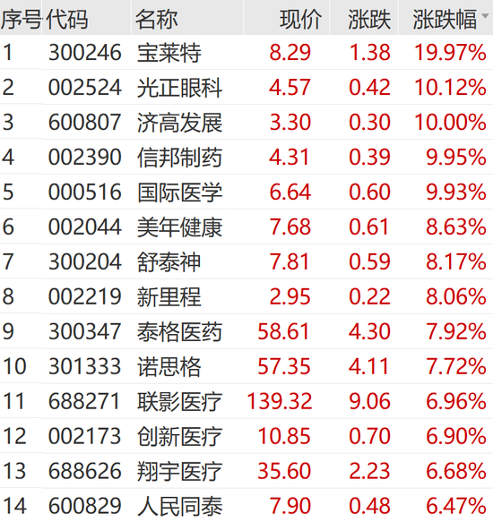 此外,上午医药生物板块整体走高,AI医疗、CRO等概念拉升。宝莱特20CM涨停,国际医学等涨停,美年健康盘中触及涨停,泰格医药、诺思格等均有明显涨幅。