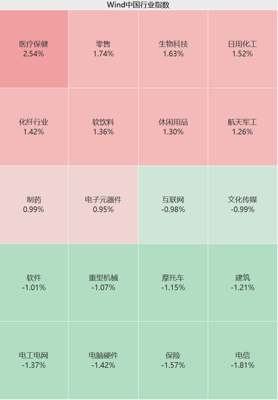 行业板块方面,上午医疗保健、AI眼镜、消费电子、食品饮料、零售等概念涨幅居前;电信、保险、光伏、游戏等板块不振。