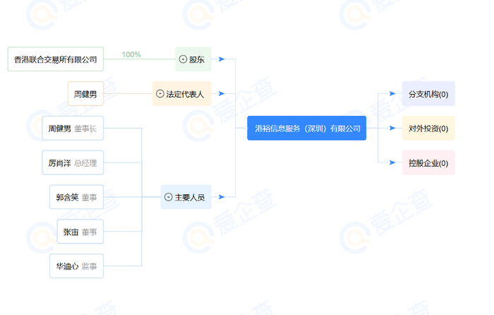 港裕信息公司全称为港裕信息服务(深圳)有限公司。公开资料显示,港裕信息由香港联合交易所有限公司100%控股,法定代表人为周健男。