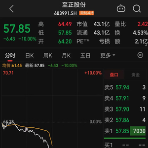 值得一提的是,至正股份(603991)成为早盘唯一跌停个股。上午11时15分之后,该股突然开启跳水模式,随后直冲跌停板。截至午间收盘,报57.85元/股,下跌10%。