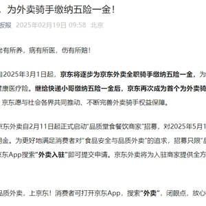 同在2月19日,京东黑板报发文,自2025年3月1日起,京东将逐步为京东外卖全职骑手缴纳五险一金,为兼职骑手提供意外险和健康医疗险。继给快递小哥缴纳五险一金后,京东成为首个为外卖骑手缴纳五险一金的平台。
