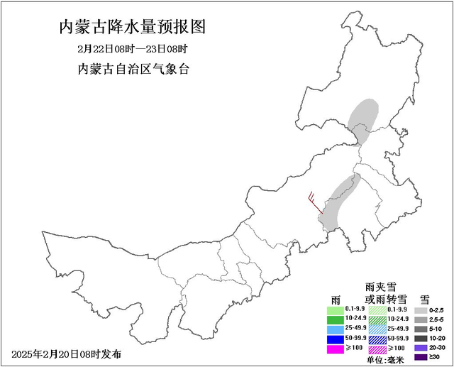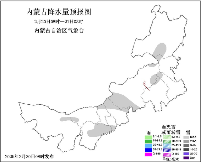 未来三天(2月20日~22日),内蒙古整体降雪强度不大。今天,在我区西部偏东、中部大部和东部偏西地区,有分散性小雪。明后天降雪范围缩小,明天,中部偏东北和东部偏西地区有分散性小雪,后天,中部偏东和东部偏西地区有分散性小雪,总体降雪较少。但未来三天,风力依旧强劲,主要在中部偏东和东南部偏西地区,有4、5级短时6级大风,风寒效应显著,外出时需做好防寒保暖准备。