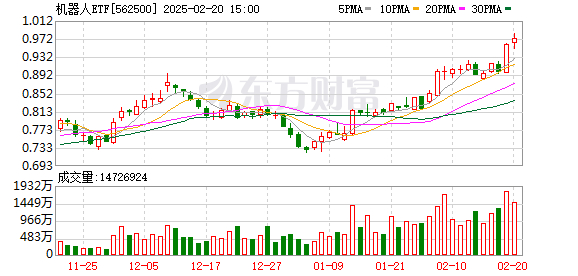 与此同时,午后,机器人板块再度拉升。长盛轴承午后大涨超15%,再创历史新高,股价涨超110元,相比去年2月6日最低价10.84元股价涨超10倍,累计涨幅超830%。机器人ETF一度大涨超2%。