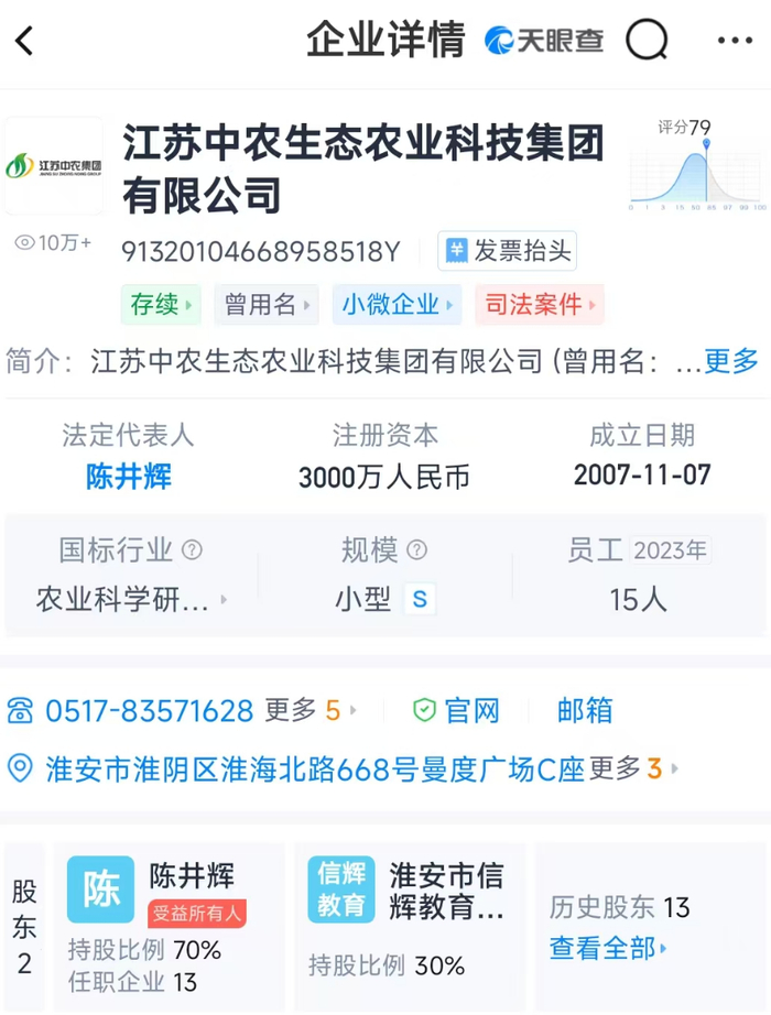 江苏中农集团的官网显示,该集团全称江苏中农生态农业科技集团有限公司,是一家以大健康产业和地产开发运营为战略双翼的多元化产业集团,陈井辉为创始人兼董事长。