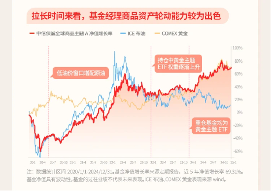 优异的业绩得益于基金经理顾凡丁在不同经济阶段对原油、黄金等大宗商品资产进行不同比例的组合配置。